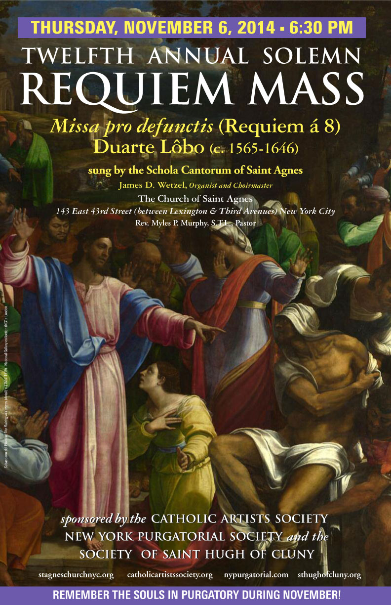 The New York Purgatorial Society is a pious association dedicated to assisting the poor souls in Purgatory, under the patronage of St. Michael the Archangel. Members hear Mass (Usus Antiquior) on the last Monday of every month at St. Agnes Church (143 East 43rd St., between Lexington Ave. and Third Ave.) and pray daily for the repose of the souls of the faithful departed (one Our Father, one Hail Mary, and one Glory Be). A Solemn High Mass with polyphony is offered annually on the feast of All Souls.