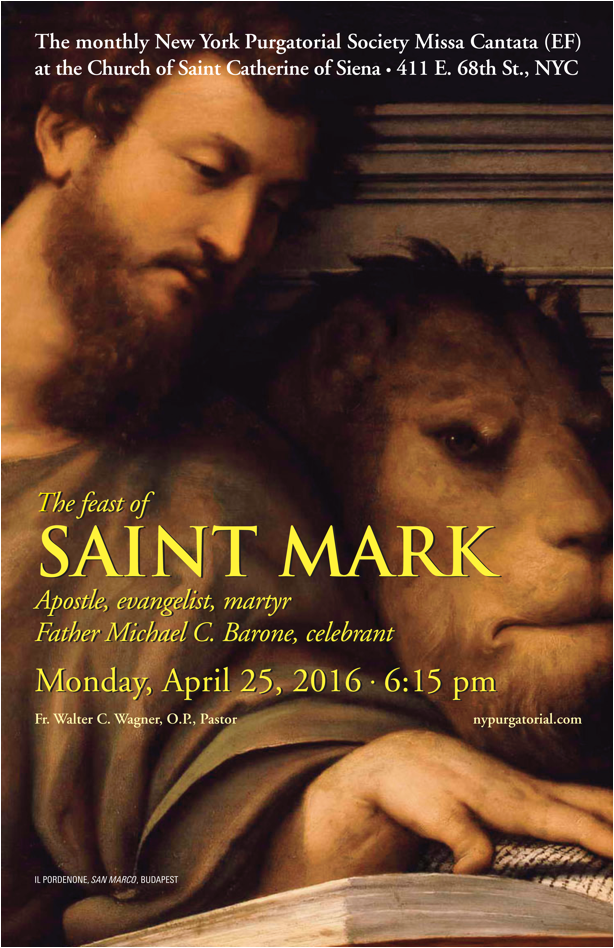 The New York Purgatorial Society is a pious association dedicated to assisting the poor souls in Purgatory, under the patronage of St. Michael the Archangel. Members hear Mass (Usus Antiquior) on the last Monday of every month at the Church of St. Catherine of Siena (411 East 68th Street, between First and York) and pray daily for the repose of the souls of the faithful departed (one Our Father, one Hail Mary, and one Glory Be). A Solemn Mass with polyphony is offered annually on or around the feast of All Souls.