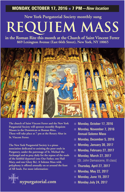 The New York Purgatorial Society is a pious association dedicated to assisting the poor souls in Purgatory, under the patronage of St. Michael the Archangel. Members hear Mass (Usus Antiquior) monthly and pray daily for the repose of the souls of the faithful departed (one Our Father, one Hail Mary, and one Glory Be). A Solemn Mass with polyphony is offered annually on or around the feast of All Souls.