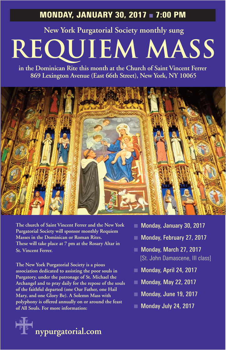 The New York Purgatorial Society is a pious association dedicated to assisting the poor souls in Purgatory, under the patronage of St. Michael the Archangel. Members hear Mass (Usus Antiquior) monthly and pray daily for the repose of the souls of the faithful departed (one Our Father, one Hail Mary, and one Glory Be). A Solemn Mass with polyphony is offered annually on or around the feast of All Souls.