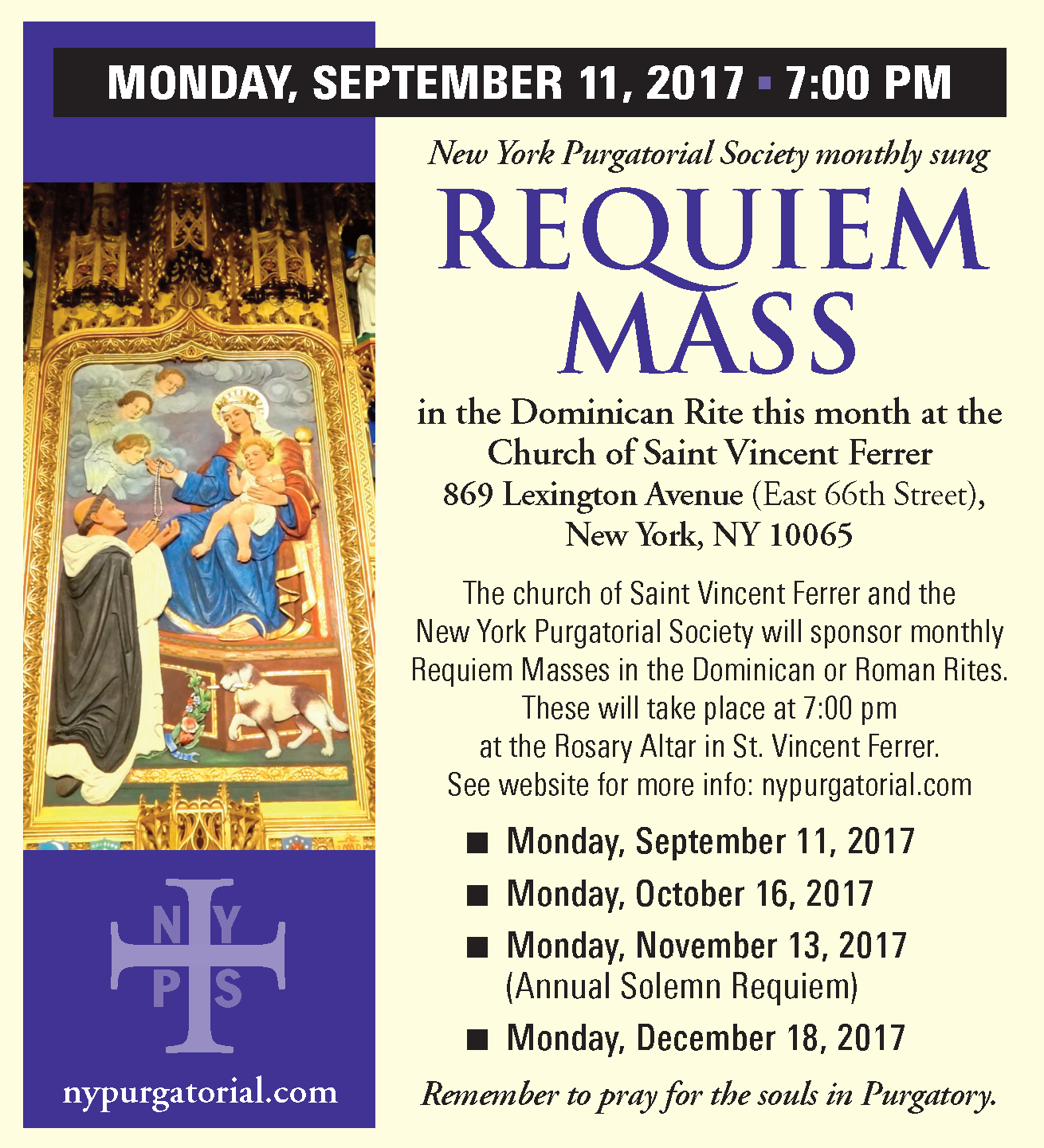 The New York Purgatorial Society is a pious association dedicated to assisting the poor souls in Purgatory, under the patronage of St. Michael the Archangel. Members hear Mass (Usus Antiquior) monthly and pray daily for the repose of the souls of the faithful departed (one Our Father, one Hail Mary, and one Glory Be). A Solemn Mass with polyphony is offered annually on or around the feast of All Souls.