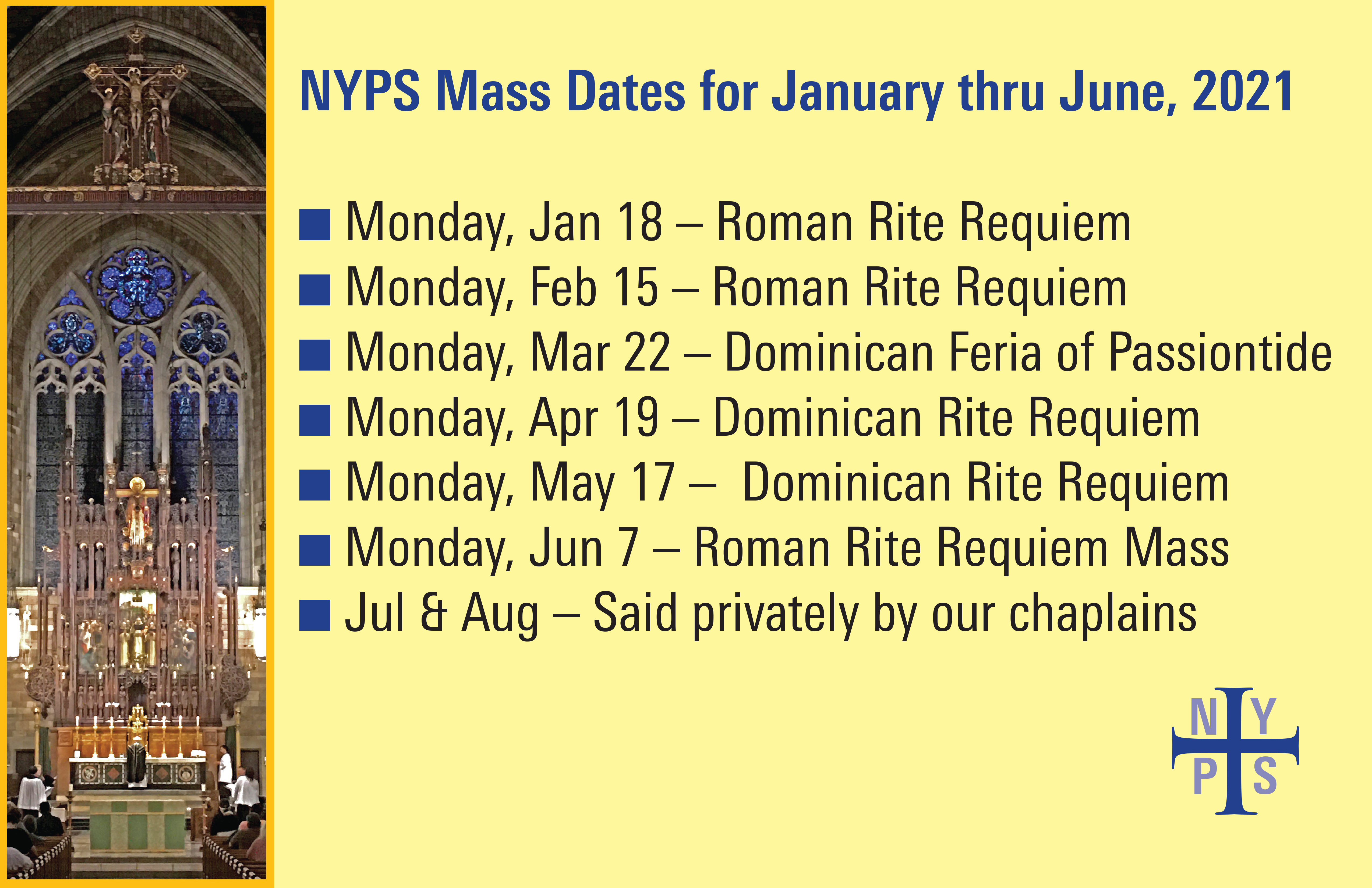 NYPS Mass Dates for January thru June, 2021